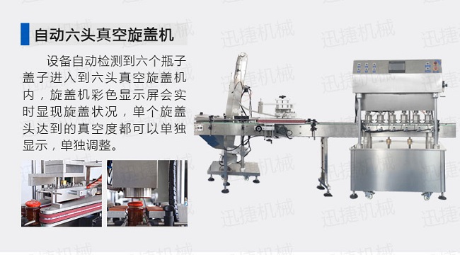 自动供瓶机+全自动滚筒洗瓶机+自动六米烘干机+自动收瓶机+全自动六头灌装机自动灌装+全自动提盖机自动理盖、提盖、挂盖+六头真空旋盖机同时六个头真空旋盖+套标机+收缩机+圆瓶贴标机+整理平台;